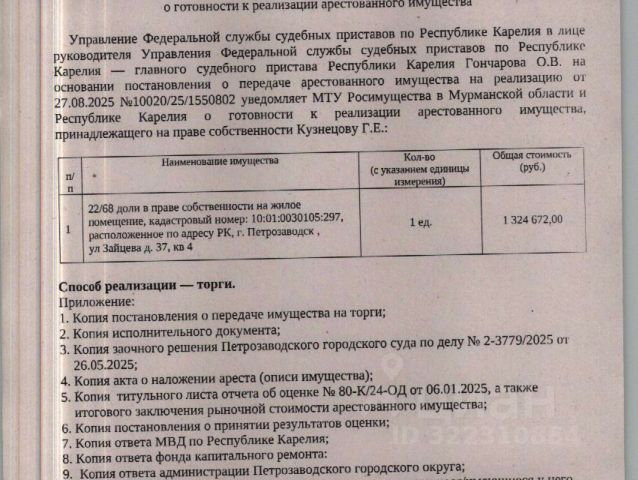 Объект размещен на ЭТП SALE. ZAKAZRF. RU Номер извещения: 23000053250000000034 Форма реализации: Аукцион. Реализация имущества должников Ссылка на объект: https://sale. zakazrf. ru/NotificationEXLot/id/74574 Дата начала приема заявок: 08. 09. 2025 13:00:00 (+03:00) Дата окончания приема заявок: 08. 10. 2025 23:59:00 (+03:00) Описание лота от организатора: Лот 6. 22/68 доли в праве собственности на жилое помещение, площадью — 67, 8 кв. м, расположенное по адресу: Республика Карелия, г. Петрозаводск, ул. Зайцева, д. 37, кв. 4, КН 10:01:0030105:297, этаж 2, форма собственности частная. Вид права общая долевая собственность.