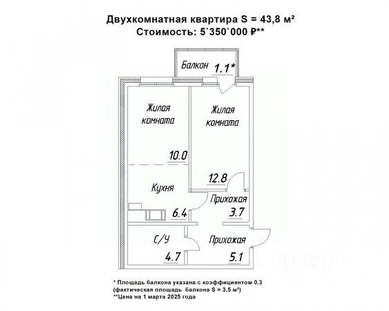 — Общая площадь: 43,3кв.м. (площадь без балкона - 37,9 кв.м.)