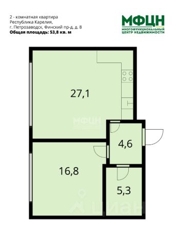 Код объекта: 1798305. Планируете продать недвижимость? Мы бесплатно оценим ваш объект и подготовим официальный отчет на бланке МФЦН. Напишите в сообщении "Оценка" или позвоните по телефону из объявления. К покупке предлагается 2 - комнатная квартира, расположенная на 5-м этаже 5 - этажного дома, находящаяся по адресу: г. Петрозаводск, Финский проезд, дом 8. О квартире: - общая площадь: 53,8 кв. м, жилая: 36 кв. м; - комнаты: 27,1 и 16,8 кв. м; - кухня: 8 кв. м; - дом панельный, построен в 2018 году, застройщик "КСМ"; - центральные системы водоснабжения, водоотведения и отопления; - на кухне электрическая плита. Преимущества квартиры: - недавно проведен косметический ремонт; - все окна: стеклопакеты; - свежий косметический ремонт; - квартира полностью мебелирована; - низкие коммунальные платежи. Инфраструктура: - рядом с домом остановка общественного транспорта; - во дворе детский сад, школа 55 в пяти минутах ходьбы от дома; - в шаговой доступности аптеки, магазины, парк для прогулок. О сделке: - прямая продажа; - никто не проживает, квартира освобождена; - быстрый выход на сделку. Звоните, задавайте вопросы в сообщениях и записывайтесь на просмотр в любое удобное для Вас время! МФЦН — Для главных сделок в жизни!
