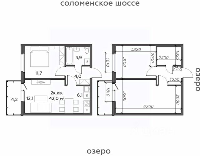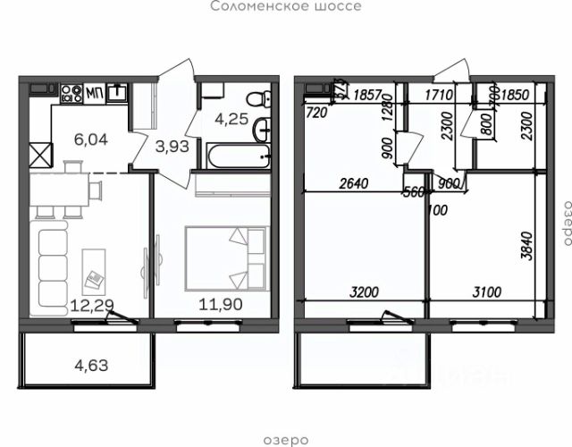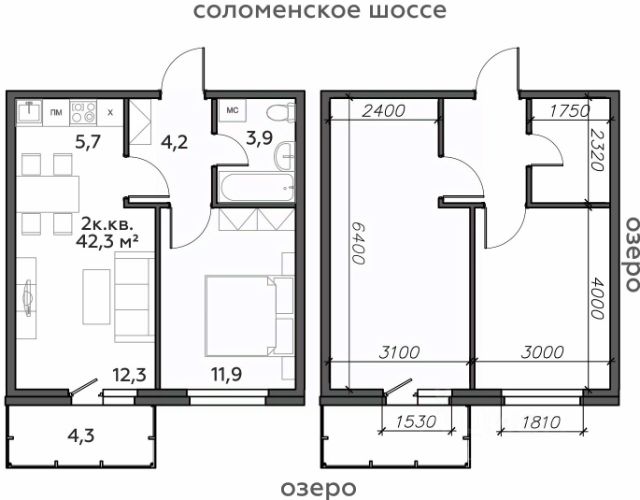 — Общая площадь: 43,3кв.м. (площадь без балкона - 37,9 кв.м.)