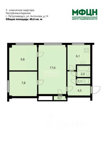 Код объекта: 1856401. Жилая недвижимость Планируете продать недвижимость? Мы бесплатно оценим ваш объект и подготовим официальный отчет на бланке МФЦН. Напишите в сообщении "Оценка" или позвоните по телефону из объявления. К покупке предлагается 3 - комнатная квартира, расположенная на 1-м этаже 5 - этажного дома, находящаяся по адресу: г. Петрозаводск, ул. Антонова, дом 14. О квартире: - общая площадь: 49,6 кв. м, жилая: 35,2 кв. м; - комнаты: 7,8; 9,8; 17,6 кв. м; - кухня: 6,1 кв. м; - дом панельный, построен в 1976 году; - центральные системы водоснабжения, водоотведения и отопления; - на кухне газовая плита. Преимущества квартиры: - выполнен косметический ремонт; - окна стеклопакеты; - раздельный санузел; - тихий и спокойные соседи. Инфраструктура: - рядом с домом остановка общественного транспорта: 16, 7, 4, 26, 6, 10. - в следующем дворе школа 3 и детский сад 115 "Якорёк"; - в шаговой доступности аптеки, магазины, поликлиника 4 и спортивный комплекс "Газпром". О сделке: - прямая продажа; - никто не зарегистрирован, один собственник; - быстрый выход на сделку. Звоните, задавайте вопросы в сообщениях и записывайтесь на просмотр в любое удобное для Вас время! МФЦН — Для главных сделок в жизни! 3-комнатная квартира на улице Антонова в городе Петрозаводск.