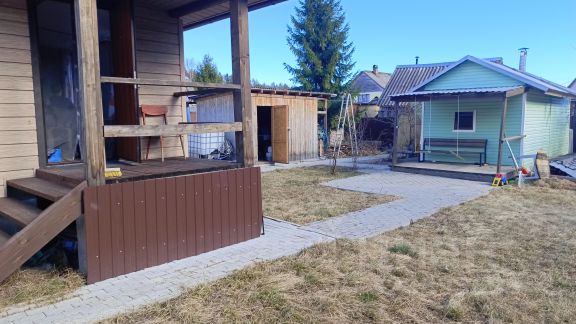 Баня 3,7х7,2 м (комната отдыха с камином 2,3х3,33, моечная 2,3х1,5, парилка 1,7х2,3), коридор с зоной для работы или отдыха, жилая комната на втором этаже 4,78х2,56, подведена вода, построена новая терраса. В комнате 2 кровати и комод, есть ниша в коридоре на втором этаже, в комнате на первом этаже мебель собирается в двуспальное место. Одновременно в доме и бане могут разместиться 10 человек.