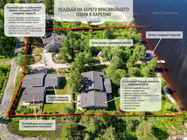 Усадьбу на бepeгу оз. Укшозеро нa шикapнoм видовом участкe 0.75 Га, paспoлoжeнном нa 1 бepeгoвой линии напротив дачи Б.Н.Ельцина.