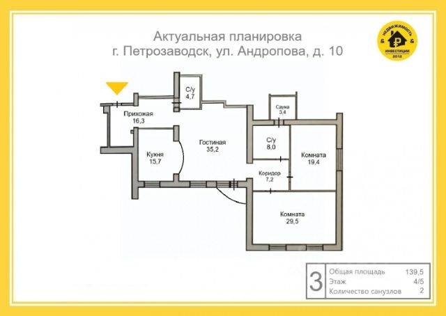 Код объекта: 1552603. ЭКСКЛЮЗИВНОЕ ПРЕДЛОЖЕНИЕ! Роскошная 3-комнатная квартира с САУНОЙ в самом сердце Петрозаводска Ваш идеальный дом в историческом центре города Представляем вашему вниманию просторную трехкомнатную квартиру в престижном районе Петрозаводска по адресу: ул. Андропова, 10. Это не просто жилье это воплощение комфорта и статуса для взыскательных покупателей. Технические характеристики: * Общая площадь: 139,4 м² * Жилая площадь: 64,6 м² * Этаж: 4 из 5 * Тип дома: кирпичный * Высота потолков: 2,85 м Преимущества квартиры: * Изолированные комнаты для комфортного проживания * Два санузла для удобства всей семьи * Собственная сауна * Уединенная атмосфера в центре города * Удобная транспортная доступность Не упустите возможность стать владельцем этой великолепной квартиры с собственной сауной и роскошным ремонтом! Звоните прямо сейчас для организации просмотра! Мы гарантируем безопасную сделку и юридическую поддержку нашим Клиентам. Поможем одобрить ипотеку с сниженной ставкой. Купить квартиру на улице Андропова в городе Петрозаводск.