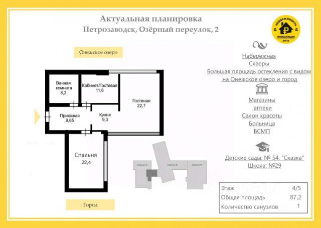 Компания "Недвижимость & Инвестиции" предлагает Вашему вниманию роскошную трехкомнатную квартиру евро-планировки в доме премиум класса AQUAMARINE, г. Петрозаводск, пер. Озерный, д. 2. ДОБРО ПОЖАЛОВАТЬ В МИР ЭЛИТНОЙ НЕДВИЖИМОСТИ ПЕТРОЗАВОДСКА. Жилой Комплекс "Aquamarine" ваш идеальный выбор для комфортного проживания. Мы рады представить вам уникальный ассортимент престижных объектов недвижимости, которые олицетворяют роскошь, комфорт и безупречный стиль. Компания "Недвижимость и Инвестиции" гарантирует вам лучшую цену и индивидуальный подход даже к самому требовательному клиенту. Не упустите свою возможность обладать собственным уголком рая на берегу Онежского озера. ОСНОВНЫЕ ПРЕИМУЩЕСТВА КВАРТИРЫ: В квартире выполнена эксклюзивная дизайнерская отделка. Использовались только качественные материалы. Спокойные пастельные тона, создают в квартире атмосферу покоя, легкости и изысканности. Квартира укомплектована всей необходимой бытовой техникой и мебелью для комфортного проживания. Элегантные предметы мебели и сантехники существенно меняют подход к формированию персонального интерьера и оправдает ожидания даже самых взыскательных эстетов. Квартира расположена на 4 этаже из 10. Секция В. Общая площадь: 87,2 кв.м. Планировка: кухня-гостиная 32 кв.м., спальня 22,4 кв.м., кабинет/гостевая 11,6 кв.м., ванная комната 8,2 кв.м., прихожая 9,65 кв.м. Высота потолков: 3,1 м. Высокие потолки не только делают комнаты более светлыми, но и обеспечивают комфортный объём воздуха. Вид из окон на Онежское озеро и город. Каждая квартира отличается от другой своим метражом, формой и видом из окна. Благоустроенная закрытая территория проекта предлагает множество зон для отдыха и общения на свежем воздухе, где вы сможете провести время с семьей и друзьями, наслаждаясь комфортом и роскошью. Дом расположен на собственном просторном участке. Большой внутренний двор оформлен согласно авторскому дизайн-проекту. Здесь вы найдете безопасную детскую территорию для активного времяпровождения вашего ребенка. Пространство в "Aquamarine" предлагает все удобства городской жизни в шаговой доступности. Вы сможете легко и быстро добраться до городских учреждений, набережной, спортивных клубов, магазинов и ресторанов. Мы ценим вашу безопасность, поэтому в жилом комплексе установлена трехуровневая система охраны. Система контроля доступна, видеонаблюдение (84 камеры) и охрана на объекте 24/7 обеспечат защиту и спокойствие. Собственная управляющая компания гарантирует прозрачную оплату коммунальных услуг по городским тарифам, основываясь на индивидуальных приборах учета. Ежедневная уборка общих зон и паркинга сохраняет вашу среду проживания безупречной. Не ограничивайте себя в возможностях ресепшн с консьерж-сервисом всегда готов помочь вам с решением различных вопросов и организовать вашу жизнь на высоком уровне. Закрытый охраняемый гостевой паркинг обеспечит безопасное пространство для ваших гостей и родных. Наши террасы на крыше позволят вам наслаждаться Продам квартиру (вторичка) в жк Аквамарин в Петрозаводске.
