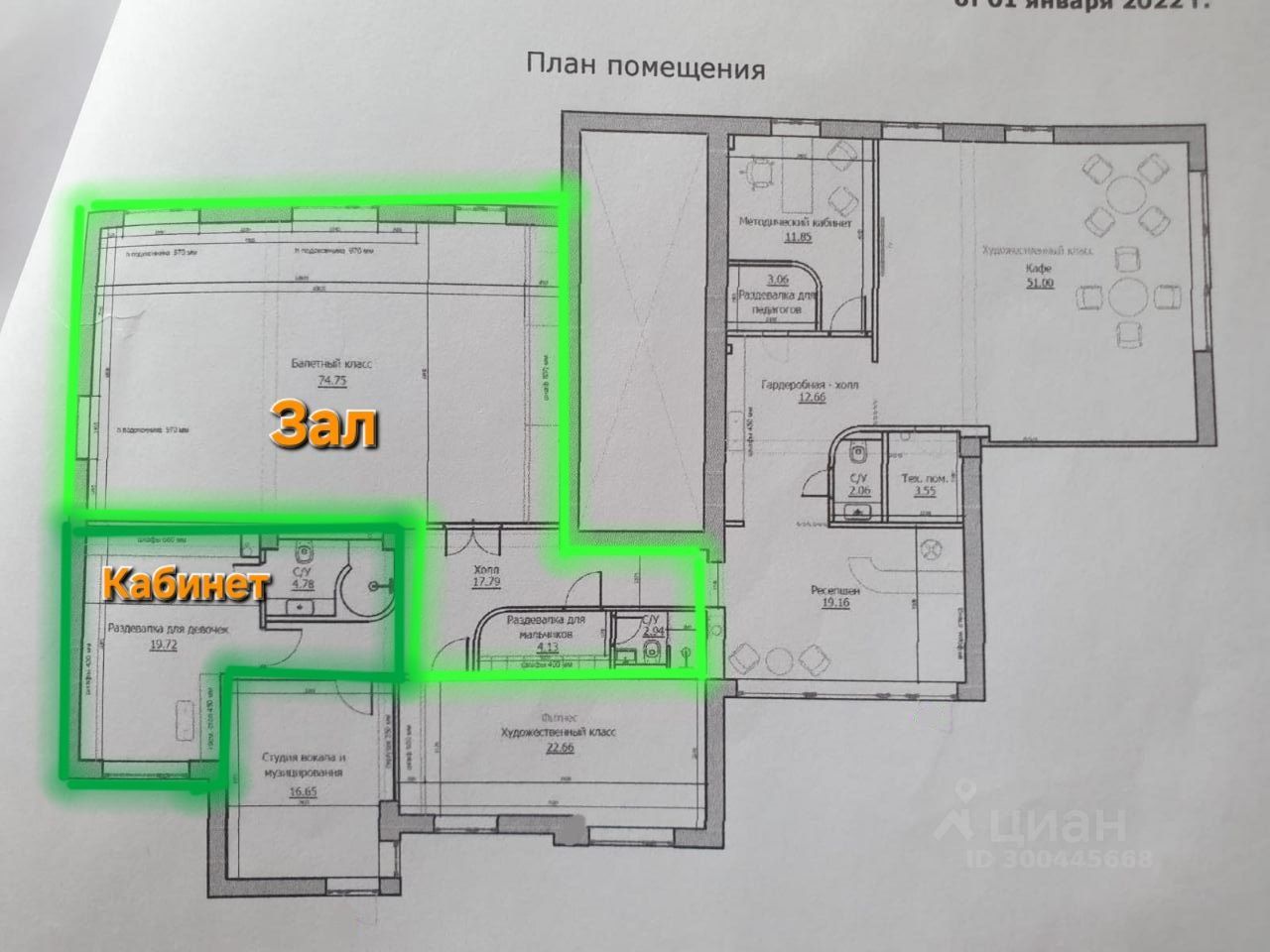Площадь кабинета — 19,72 кв.м, внутри кабинета в отдельном помещении — туалет с душевой 4,78 кв.м