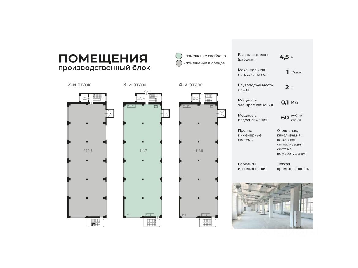 В аренду предлагается помещения под размещение легкой промышленности, общей площадью 415 кв. м, со следующими характеристиками: