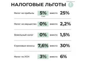• Налог на прибыль - 5% (на 5 лет), вместо 25%;