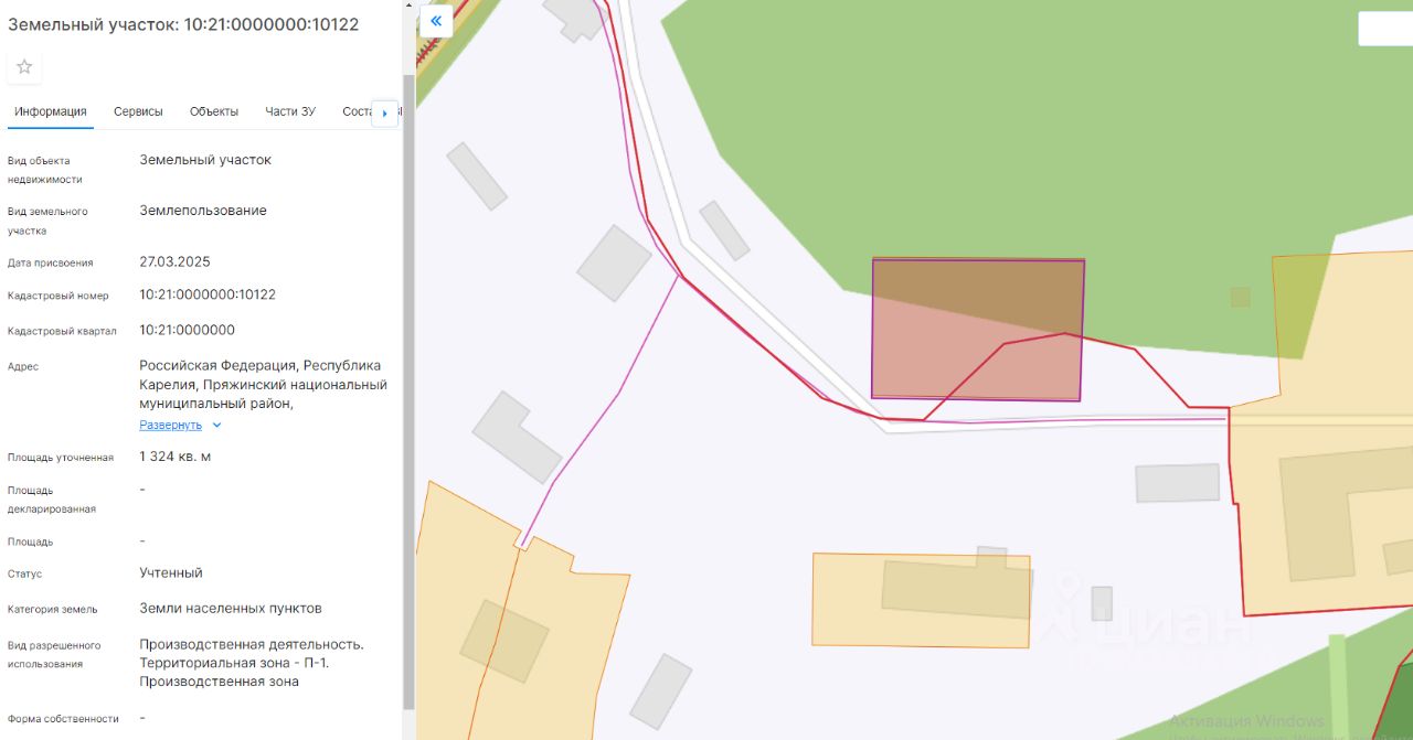 Право заключения договора аренды земельного участка из земель населенных пунктов, имеющего кадастровый номер 10:21:0000000:10122, площадью 1324 кв.м, местоположение: Российская Федерация, Республика Карелия, Пряжинский национальный муниципальный район, Ведлозерское сельское поселение, с. Ведлозеро, вид разрешенного использования "Производственная деятельность". Территориальная зона - Производственная зона (П-1).