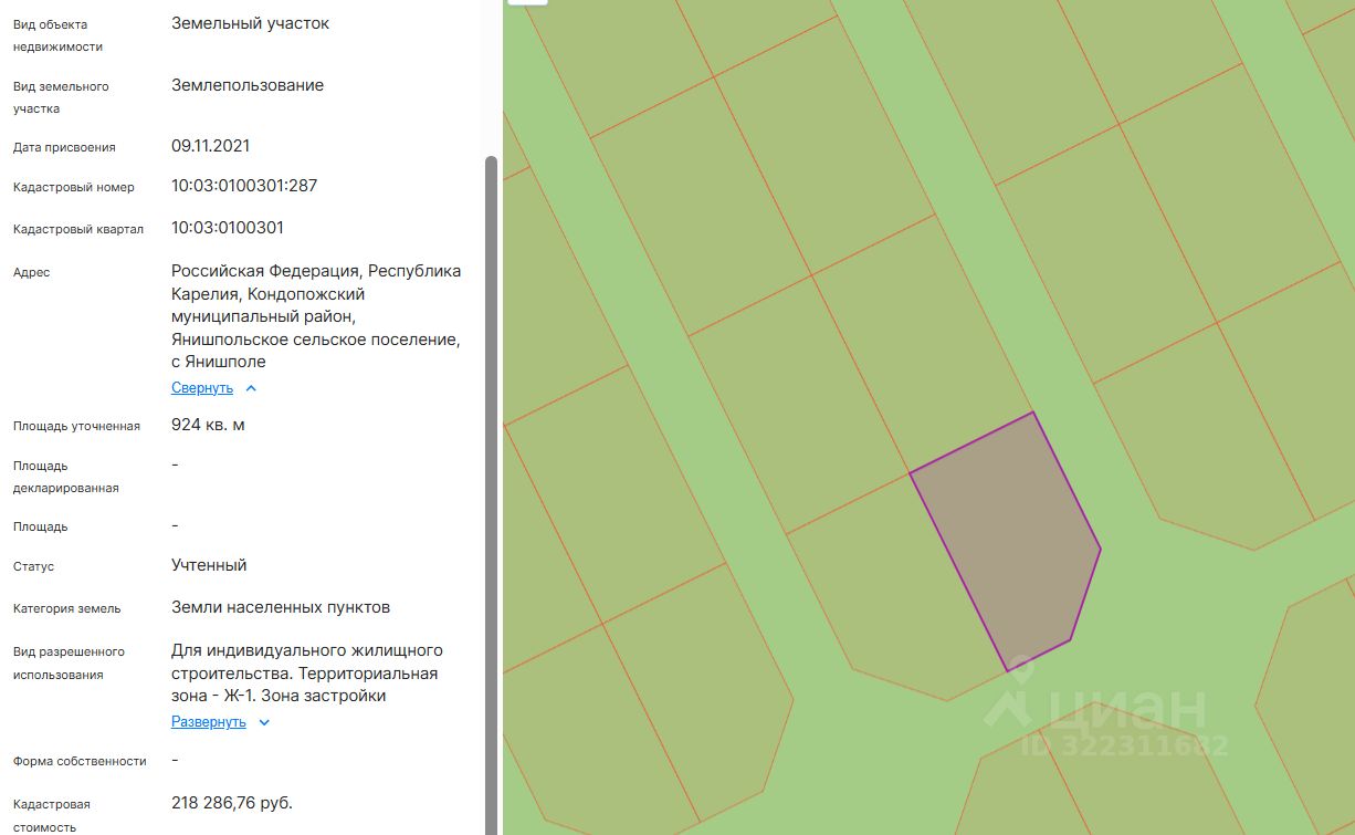 Право заключения договора аренды земельного участка из земель населенных пунктов, имеющего кадастровый номер 10:03:0100301:287, площадью 924 кв.м, местоположение: Российская Федерация, Республика Карелия, Кондопожский муниципальный район, Янишпольское сельское поселение, с Янишполе, вид разрешенного использования Для индивидуального жилищного строительства.
