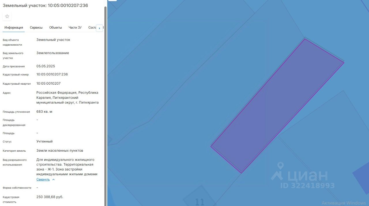 площадь 683 кв.м, местоположение: Российская Федерация, Республика Карелия, Питкярантский муниципальный округ, г. Питкяранта, вид разрешенного использования - Для индивидуального жилищного строительства.