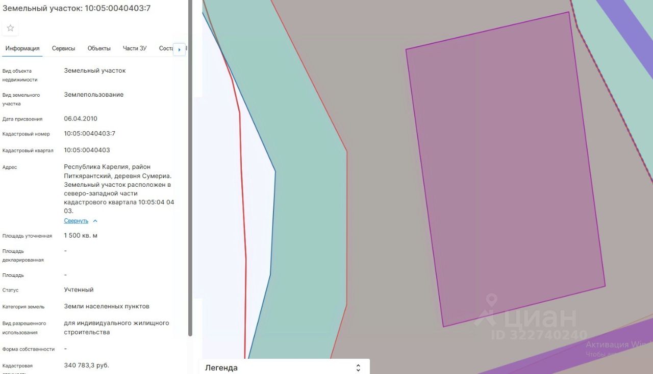 площадь 1500 кв.м, местоположение: Республика Карелия, район Питкярантский, деревня Сумериа. Земельный участок расположен в северо-западной части кадастрового квартала 10:05:040403, вид разрешенного использования - Для индивидуального жилищного строительства.