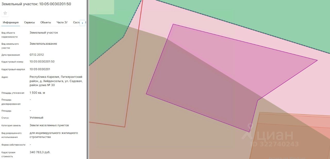 площадь 1500 кв.м, местоположение: Республика Карелия, Питкярантский район, д. Хийденсельга, ул. Садовая, район дома 30, вид разрешенного использования - Для индивидуального жилищного строительства.