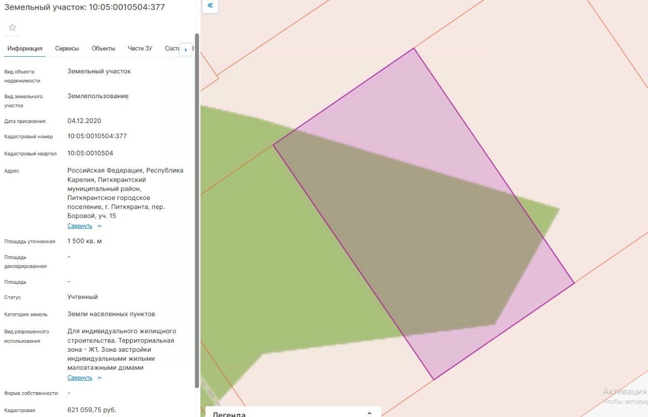 площадь 1500 кв.м, местоположение: Российская Федерация, Республика Карелия, Питкярантский муниципальный район, Питкярантское городское поселение, г. Питкяранта, пер. Боровой, уч. 15, вид разрешенного использования - Для индивидуального жилищного строительства.
