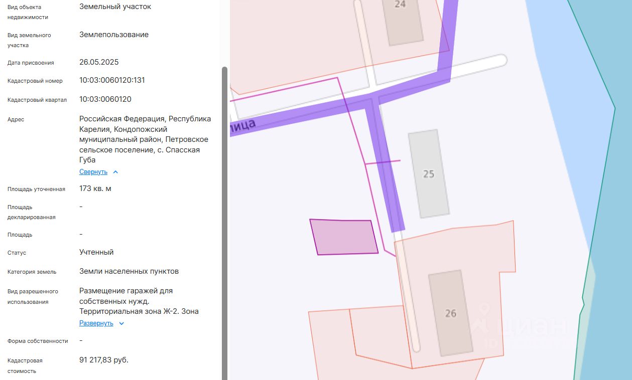 Право заключения договора аренды земельного участка из земель населенных пунктов, имеющего кадастровый номер 10:03:0060120:131, площадью 173 кв.м, местоположение: Российская Федерация, Республика Карелия, Кондопожский муниципальный район, Петровское сельское поселение, с. Спасская Губа, вид разрешенного использования - Размещение гаражей для собственных нужд.