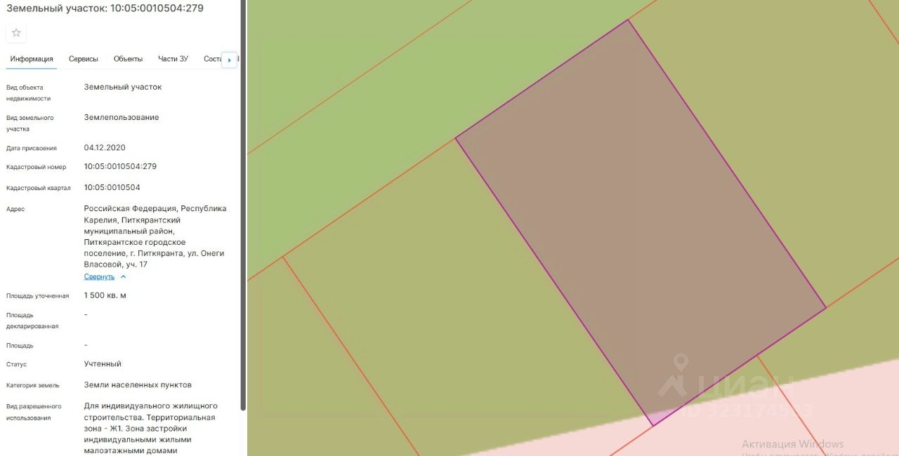 площадь 1500 кв.м, местоположение: Российская Федерация, Республика Карелия, Питкярантский муниципальный район, Питкярантское городское поселение, г. Питкяранта, ул. Онеги Власовой, уч. 17, вид разрешенного использования - Для индивидуального жилищного строительства.