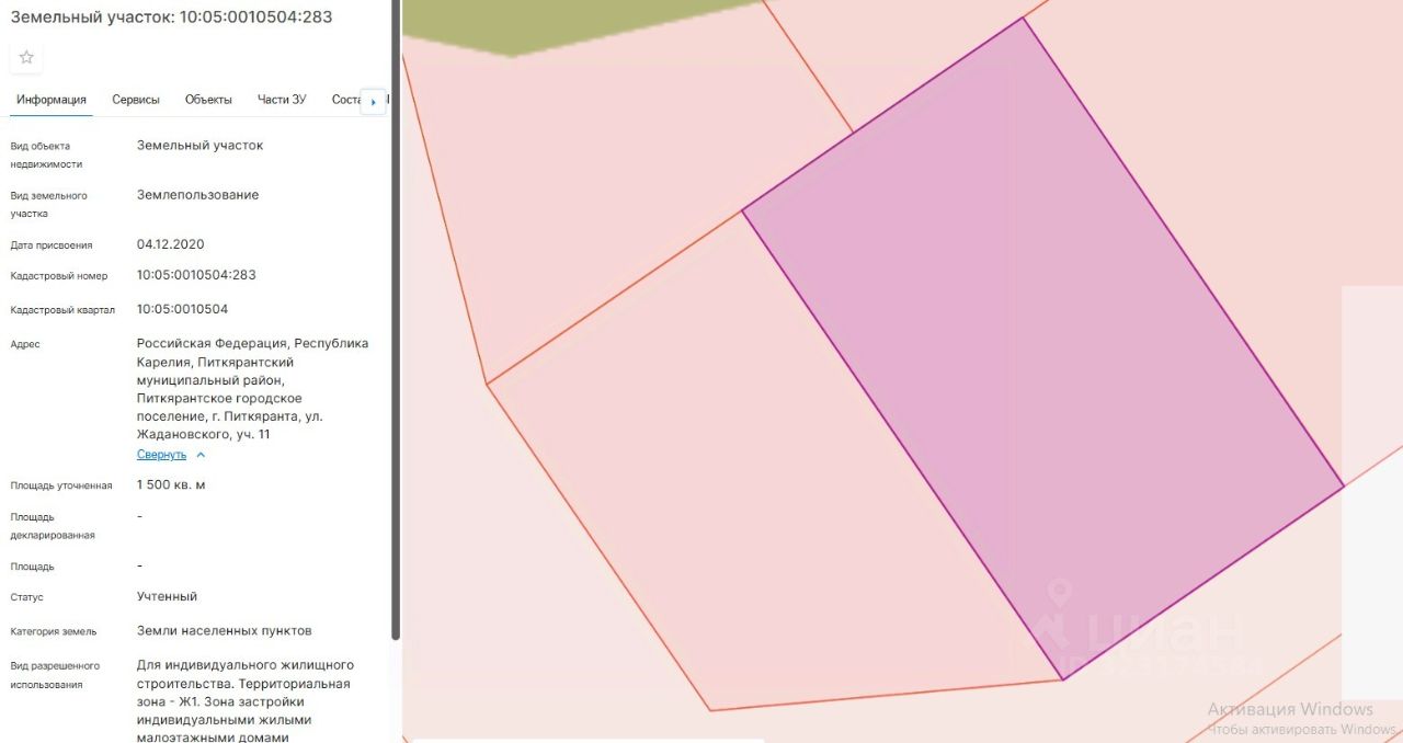 площадь 1500 кв.м, местоположение: Российская Федерация, Республика Карелия, Питкярантский муниципальный район, Питкярантское городское поселение, г. Питкяранта, ул. Жадановского, уч. 11, вид разрешенного использования - Для индивидуального жилищного строительства.