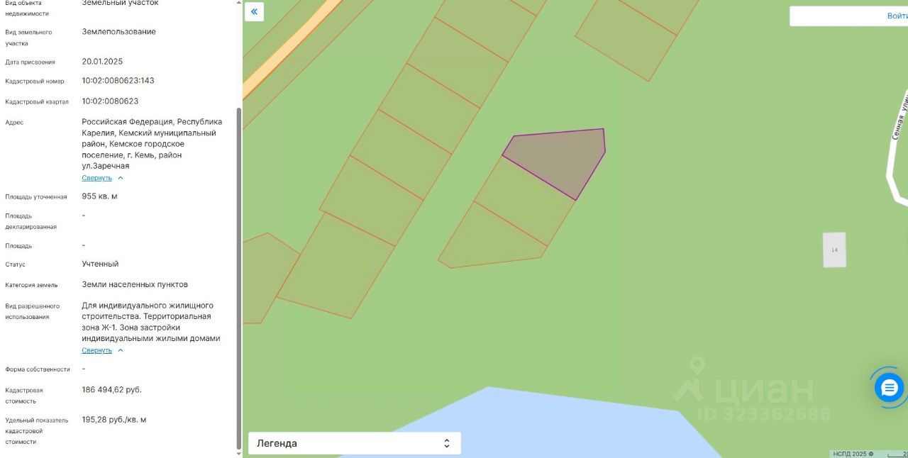 Право заключения договора аренды земельного участка из земель населенных пунктов, имеющего кадастровый номер 10:02:0080623:143, площадью 955 кв.м, местоположение: Российская Федерация, Республика Карелия, Кемский муниципальный район, Кемское городское поселение, г. Кемь, район ул. Заречная, вид разрешенного использования - "Для индивидуального жилищного строительства". Территориальная зона  "Зона застройки индивидуальными жилыми домами (Ж1)".