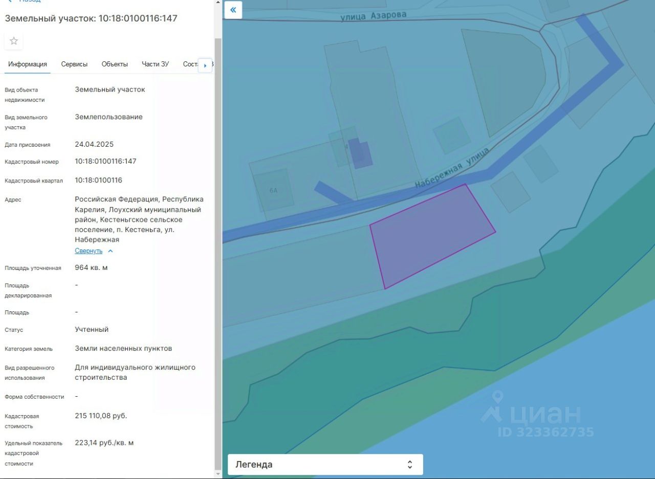 Право заключения договора аренды земельного участка из земель населенных пунктов, имеющего кадастровый номер 10:18:0100116:147, площадью 964 кв. м, местоположение: Российская Федерация, Республика Карелия, Лоухский муниципальный район, Кестеньгское сельское поселение, п. Кестеньга, ул. Набережная, вид разрешенного использования  "Для индивидуального жилищного строительства".