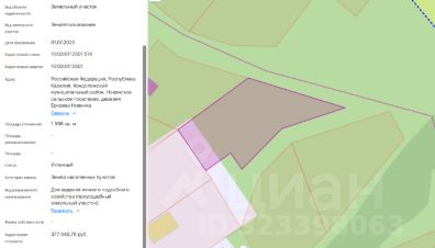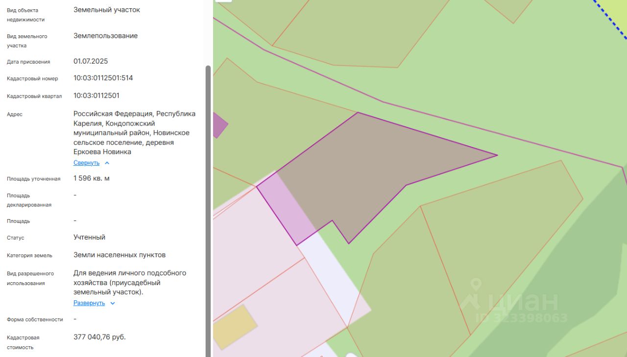 Право заключения договора аренды земельного участка из земель населенных пунктов, имеющего кадастровый номер 10:03:0112501:514, площадью 1596 кв.м, местоположение: Российская Федерация, Республика Карелия, Кондопожский муниципальный район, Новинское сельское поселение, деревня Еркоева Новинка, вид разрешенного использования Для ведения личного подсобного хозяйства (приусадебный земельный участок).