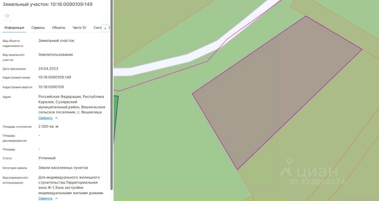 площадь 2000 кв.м, местоположение: Российская Федерация, Республика Карелия, Суоярвский муниципальный район, Вешкельское сельское поселение, с. Вешкелица, вид разрешенного использования - Для индивидуального жилищного строительства.