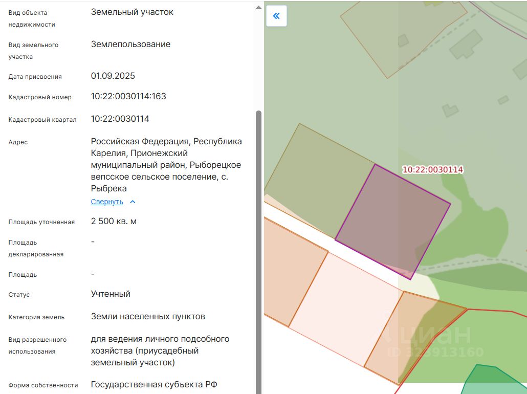 Право заключения договора аренды земельного участка из земель населенных пунктов, имеющего кадастровый номер 10:22:0030114:163, площадью 2500 кв.м, местоположение: Российская Федерация, Республика Карелия, Прионежский муниципальный район, Рыборецкое вепсское сельское поселение, с. Рыбрека, вид разрешенного использования для ведения личного подсобного хозяйства (приусадебный земельный участок).