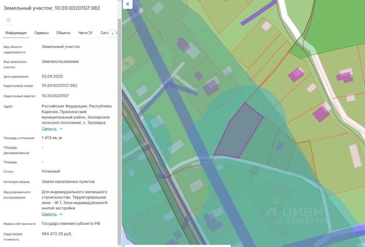 Право заключения договора аренды земельного участка из земель населенных пунктов, имеющего кадастровый номер 10:20:0020107:382, площадью 1413 кв. м, местоположение: Российская Федерация, Республика Карелия, Прионежский муниципальный район, Заозерское сельское поселение, с. Заозерье, вид разрешенного использования Для индивидуального жилищного строительства.