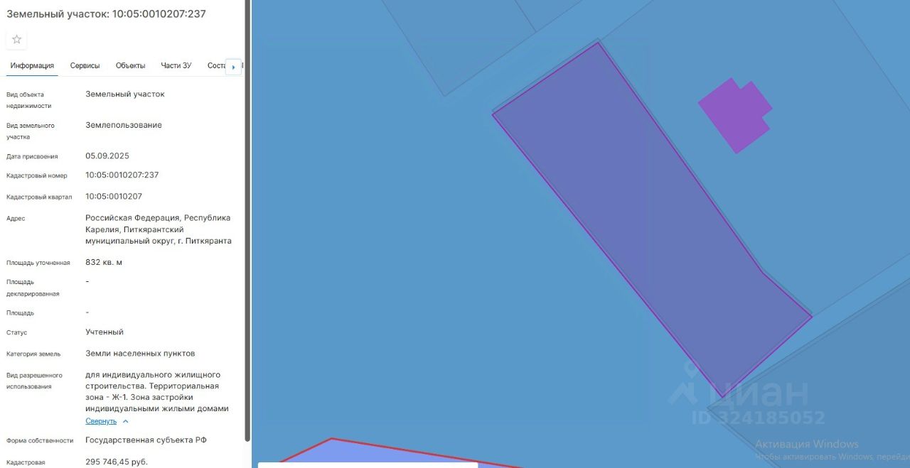 площадь 832 кв.м, местоположение: Российская Федерация, Республика Карелия, Питкярантский муниципальный округ, г. Питкяранта, вид разрешенного использования Для индивидуального жилищного строительства.