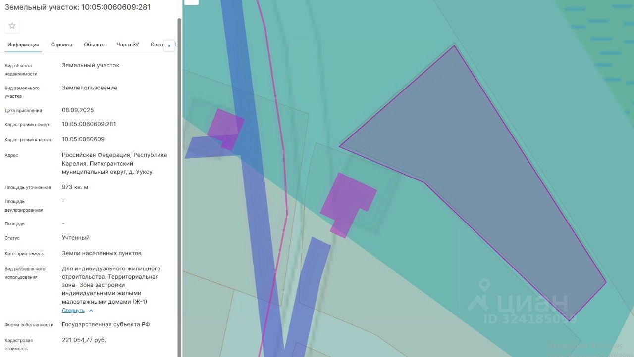 площадь 973 кв.м, местоположение: Российская Федерация, Республика Карелия, Питкярантский муниципальный округ, д. Ууксу, вид разрешенного использования Для индивидуального жилищного строительства.