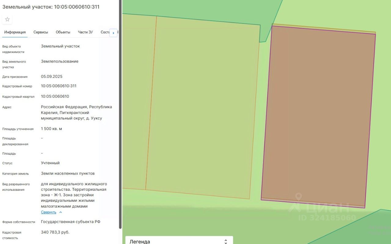 площадь 1500 кв.м, местоположение: Российская Федерация, Республика Карелия, Питкярантский муниципальный округ, д. Ууксу, вид разрешенного использования Для индивидуального жилищного строительства.