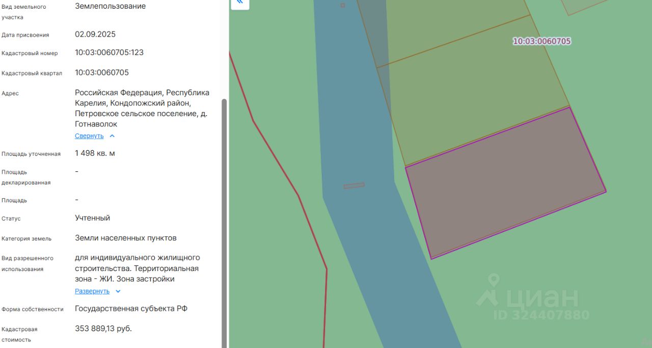Право заключения договора аренды земельного участка из земель населенных пунктов, имеющего кадастровый номер 10:03:0060705:123, площадью 1498 кв.м, местоположение: Российская Федерация, Республика Карелия, Кондопожский район, Петровское сельское поселение, д. Готнаволок, вид разрешенного использования Для индивидуального жилищного строительства.