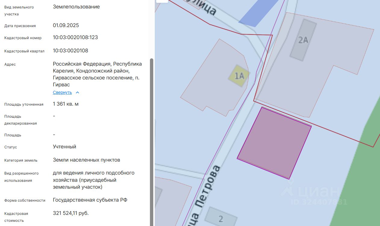 Право заключения договора аренды земельного участка из земель населенных пунктов, имеющего кадастровый номер 10:03:0020108:123, площадью 1361 кв.м, местоположение: Российская Федерация, Республика Карелия, Кондопожский район, Гирвасское сельское поселение, п. Гирвас, вид разрешенного использования для ведения личного подсобного хозяйства (приусадебный земельный участок).
