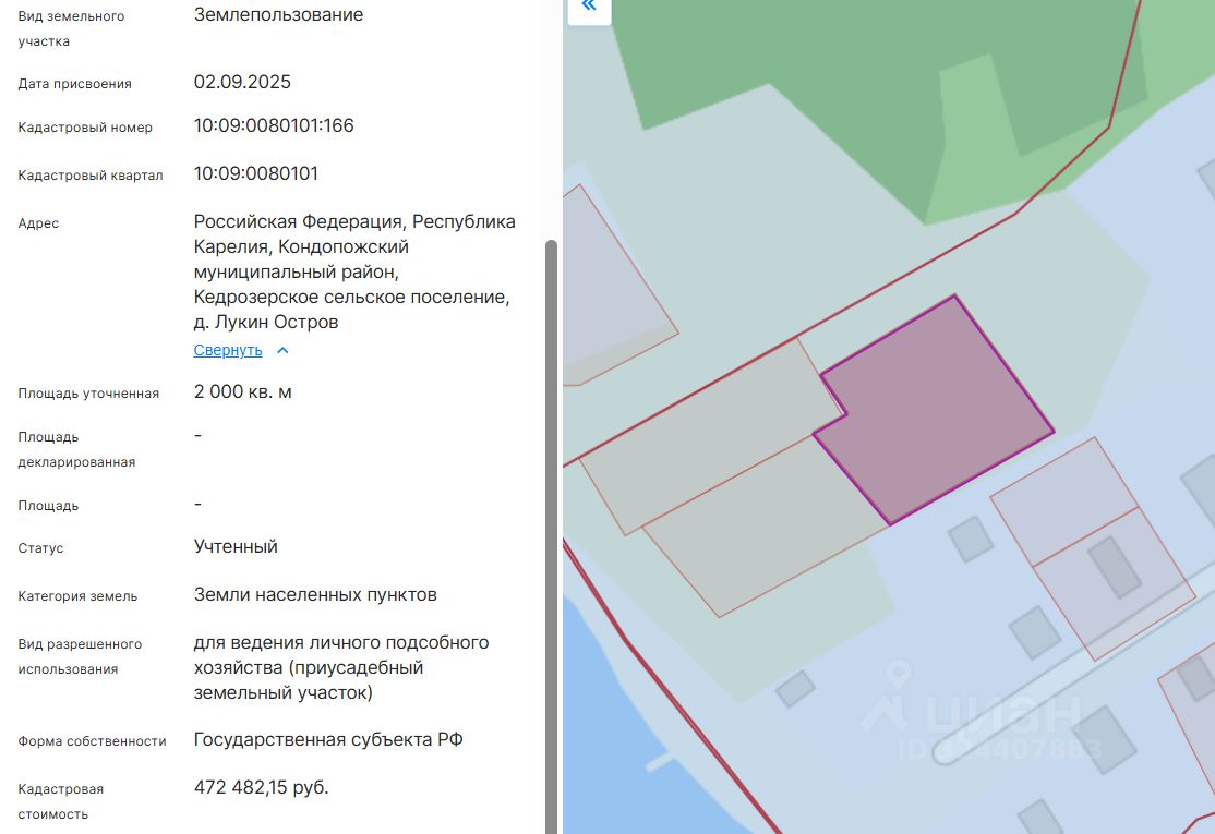 Право заключения договора аренды земельного участка из земель населенных пунктов, имеющего кадастровый номер 10:09:0080101:166, площадью 2000 кв.м, местоположение: Российская Федерация, Республика Карелия, Кондопожский муниципальный район, Кедрозерское сельское поселение, д. Лукин Остров, вид разрешенного использования для ведения личного подсобного хозяйства (приусадебный земельный участок).