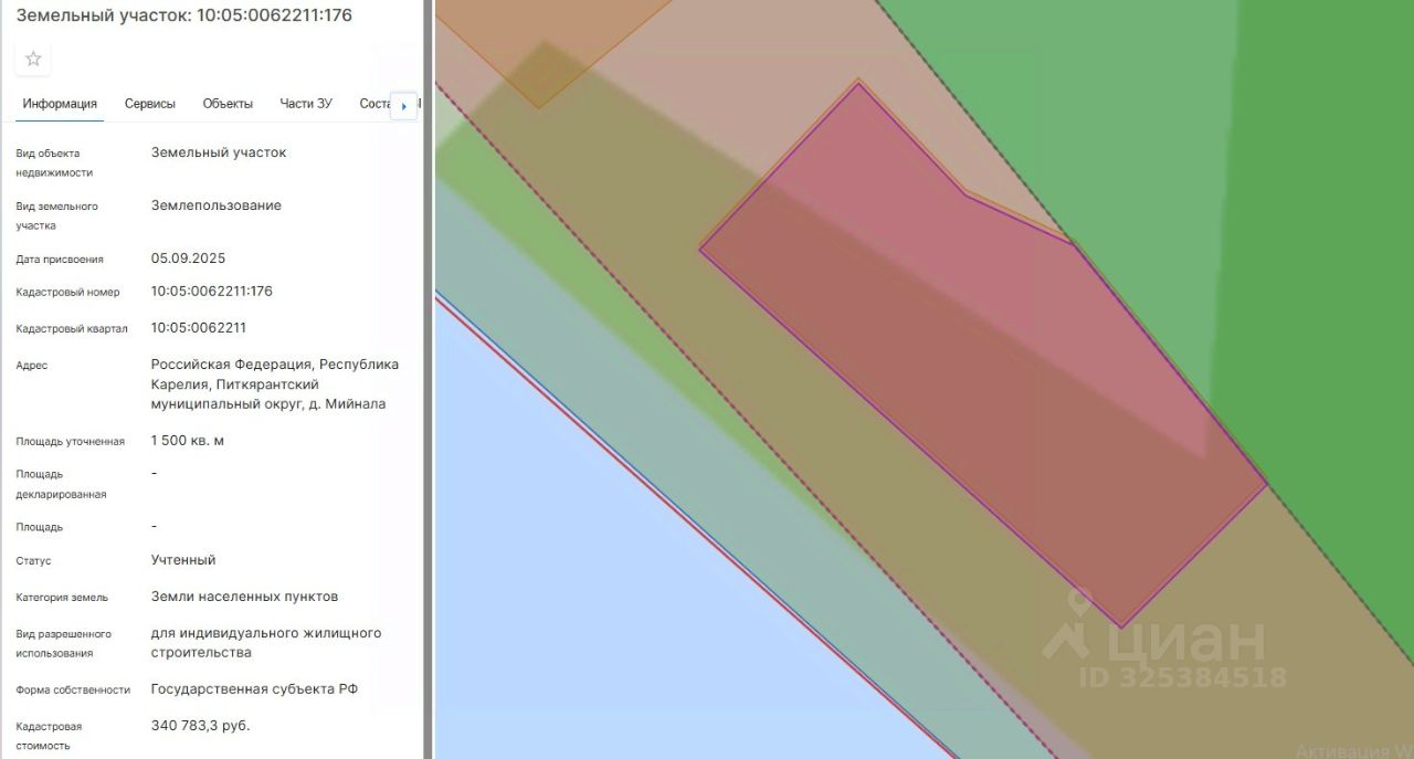 площадь 1500 кв.м, местоположение: Российская Федерация, Республика Карелия, Питкярантский муниципальный округ, д. Мийнала, вид разрешенного использования Для индивидуального жилищного строительства.