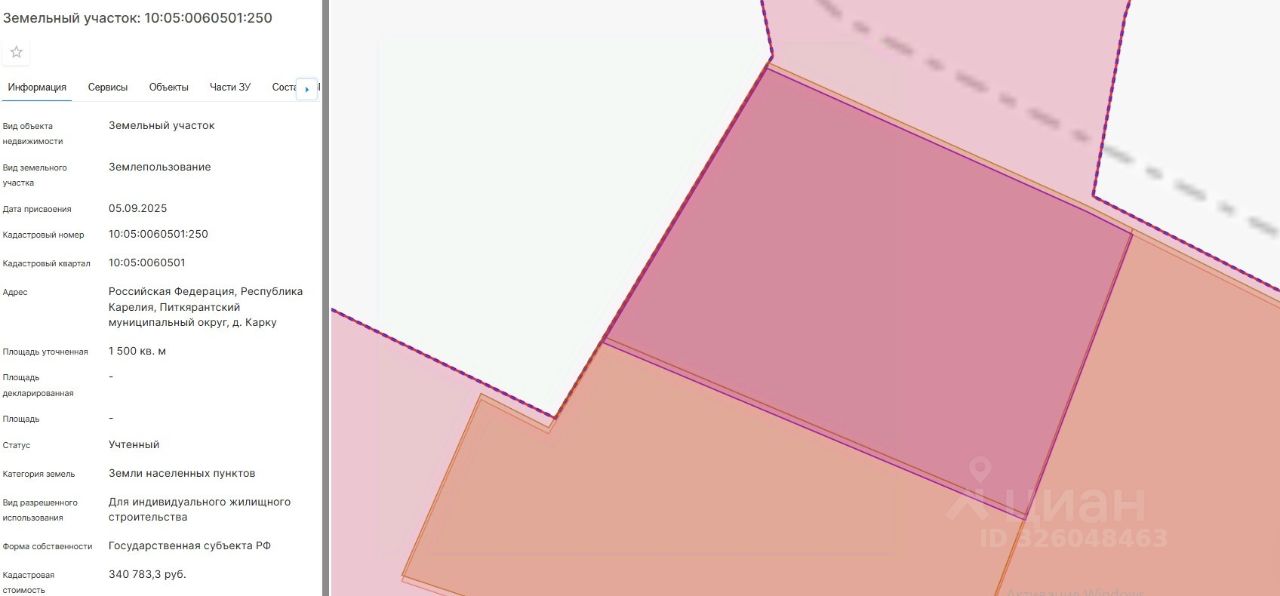 Площадь 1500 кв.м, местоположение: Российская Федерация, Республика Карелия, Питкярантский муниципальный округ, д. Карку, вид разрешенного использования Для индивидуального жилищного строительства.