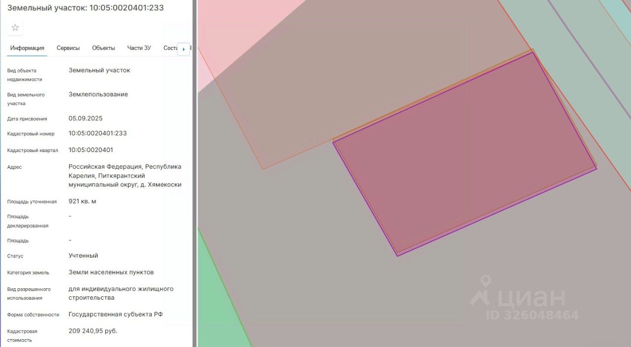 Площадь 921 кв.м, местоположение: Российская Федерация, Республика Карелия, Питкярантский муниципальный округ, д. Хямекоски, вид разрешенного использования Для индивидуального жилищного строительства.