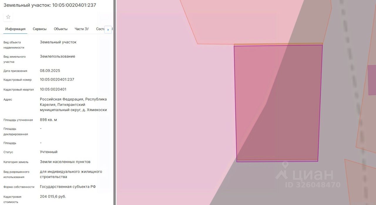 Площадь 898 кв.м, местоположение: Российская Федерация, Республика Карелия, Питкярантский муниципальный округ, д. Хямекоски, вид разрешенного использования Для индивидуального жилищного строительства.