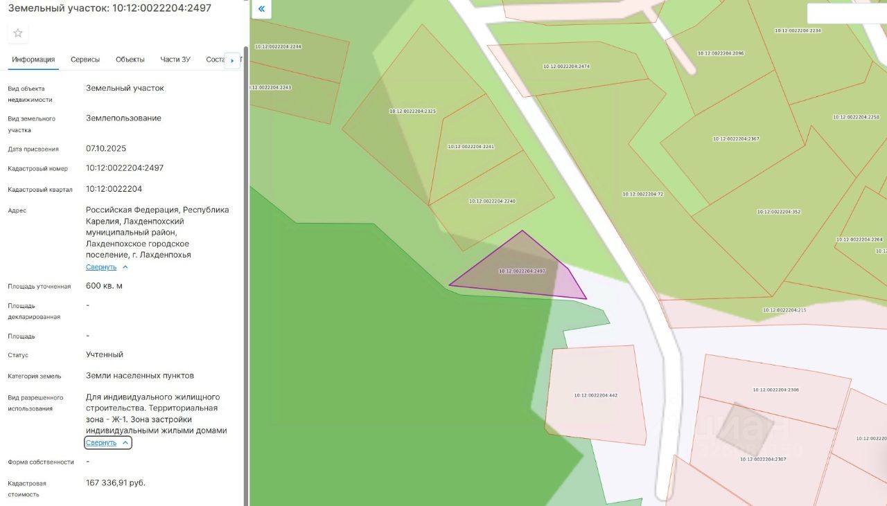 Право заключения договора аренды земельного участка из земель населенных пунктов, имеющего кадастровый номер 10:12:0022204:2497, площадью 600 кв.м, местоположение: Российская Федерация, Республика Карелия, Лахденпохский муниципальный округ, г. Лахденпохья, вид разрешенного использования - Для индивидуального жилищного строительства. Территориальная зона Зона застройки индивидуальными жилыми домами (Ж-1).
