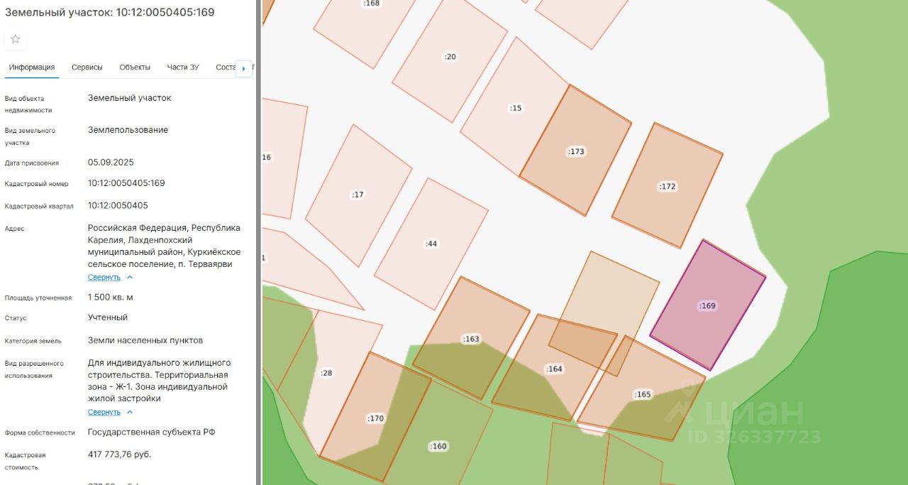 Право заключения договора аренды земельного участка из земель населенных пунктов, имеющего кадастровый номер 10:12:0050405:169, площадью 1500 кв.м, местоположение: Российская Федерация, Республика Карелия, Лахденпохский муниципальный округ, п. Терваярви, вид разрешенного использования Для индивидуального жилищного строительства.