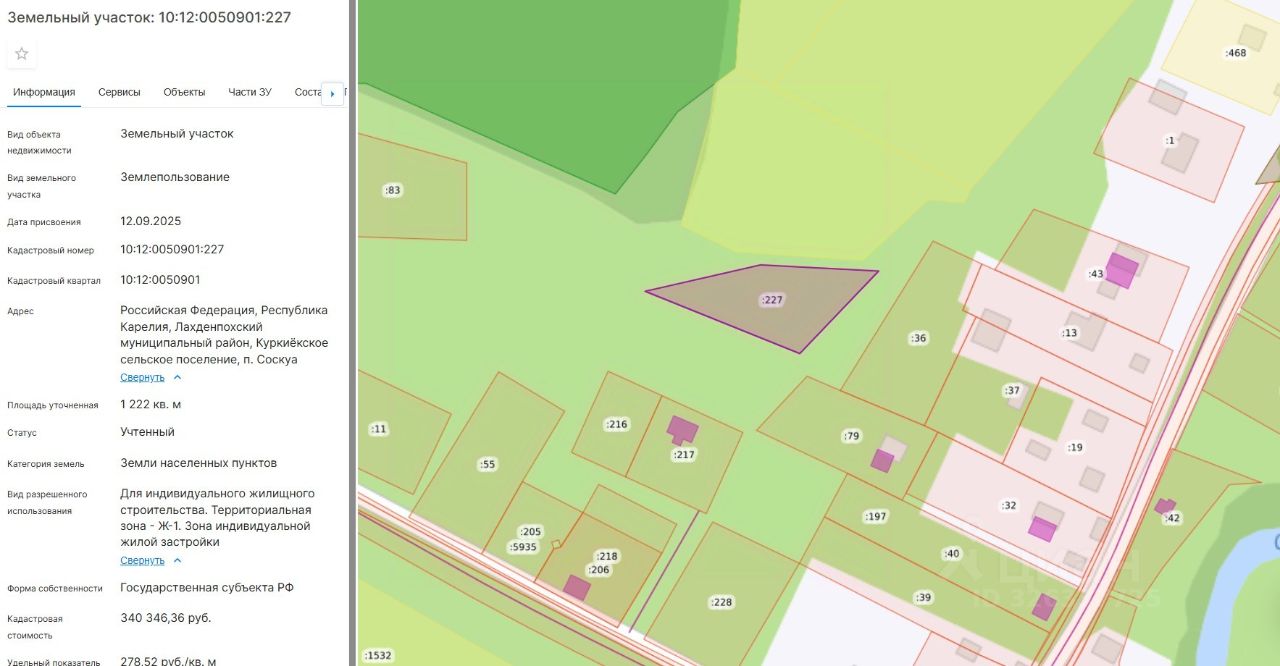 Право заключения договора аренды земельного участка из земель населенных пунктов, имеющего кадастровый номер 10:12:0050901:227, площадью 1222 кв.м, местоположение: Российская Федерация, Республика Карелия, Лахденпохский муниципальный округ, п. Соскуа, вид разрешенного использования Для индивидуального жилищного строительства.