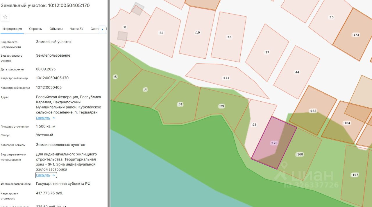Право заключения договора аренды земельного участка из земель населенных пунктов, имеющего кадастровый номер 10:12:0050405:170, площадью 1500 кв.м, местоположение: Российская Федерация, Республика Карелия, Лахденпохский муниципальный округ, п. Терваярви, вид разрешенного использования Для индивидуального жилищного строительства.