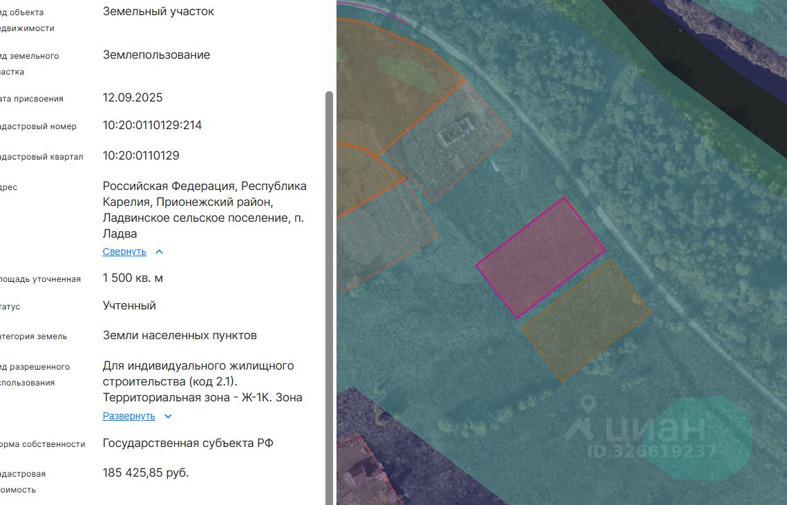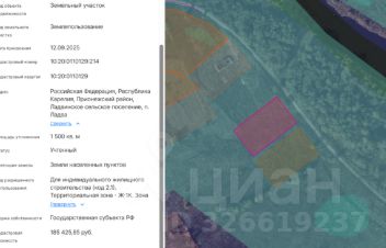 Право заключения договора аренды земельного участка из земель населенных пунктов, имеющего кадастровый номер 10:20:0110129:214, площадью 1500 кв.м, местоположение: Российская Федерация, Республика Карелия, Прионежский муниципальный район, Ладвинское сельское поселение, п. Ладва, вид разрешенного использования Для индивидуального жилищного строительства (код 2.1).