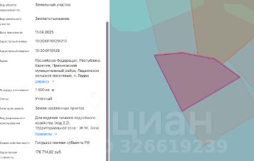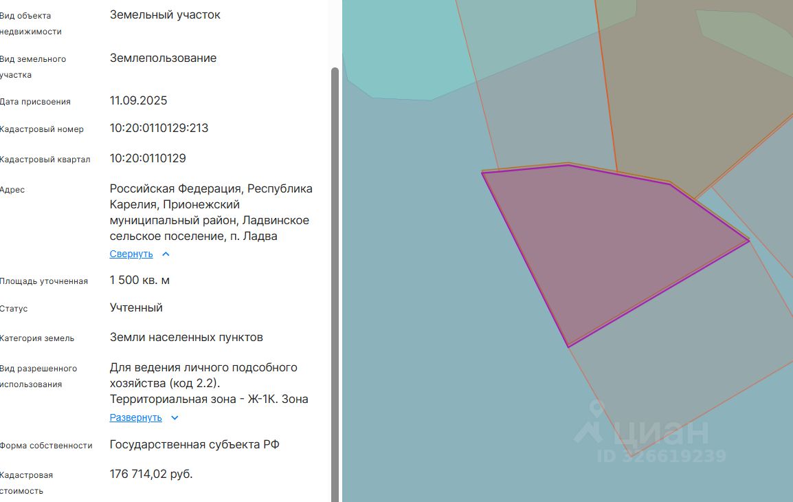 Право заключения договора аренды земельного участка из земель населенных пунктов, имеющего кадастровый номер 10:20:0110129:213, площадью 1500 кв.м, местоположение: Российская Федерация, Республика Карелия, Прионежский муниципальный район, Ладвинское сельское поселение, п. Ладва, вид разрешенного использования Для ведения личного подсобного хозяйства (код 2.2).