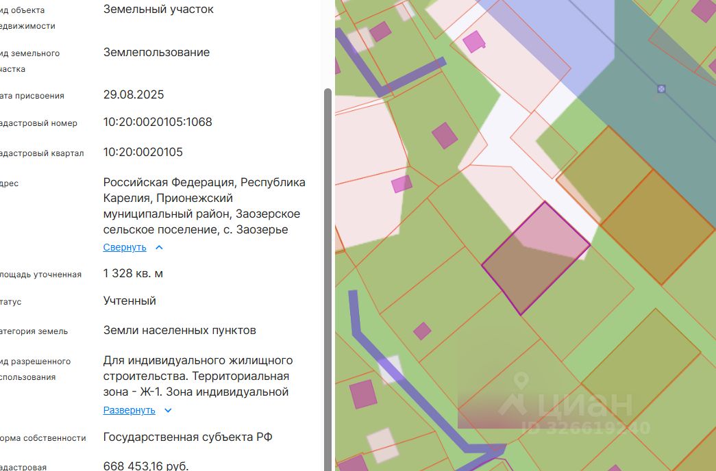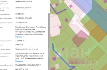 Право заключения договора аренды земельного участка из земель населенных пунктов, имеющего кадастровый номер 10:20:0020105:1068, площадью 1328 кв.м, местоположение: Российская Федерация, Республика Карелия, Прионежский муниципальный район, Заозерское сельское поселение, с. Заозерье, вид разрешенного использования Для индивидуального жилищного строительства.