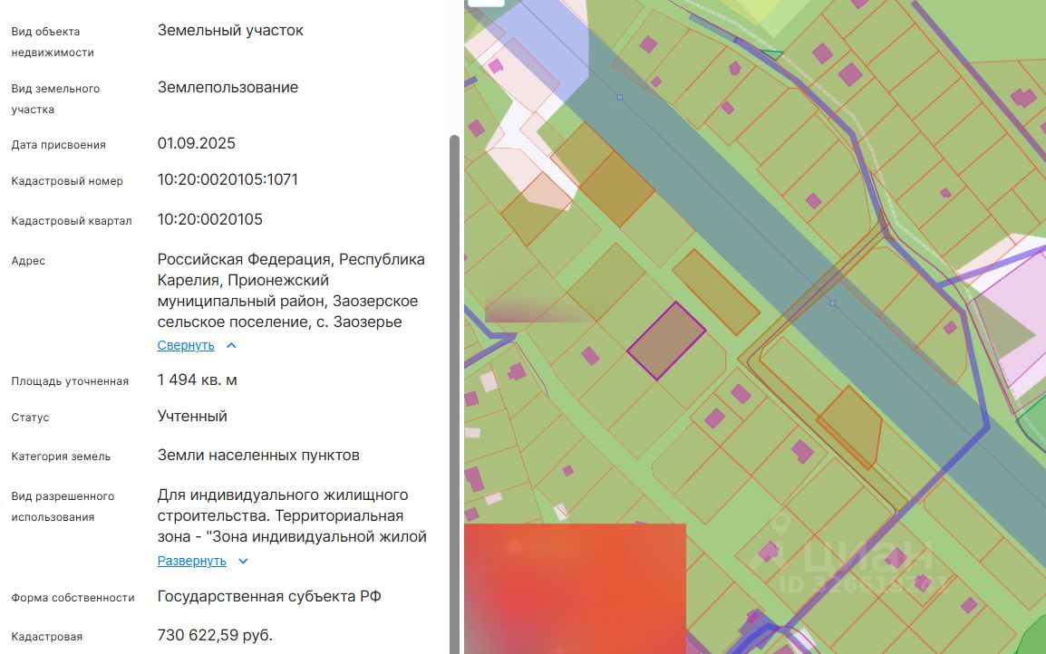 Право заключения договора аренды земельного участка из земель населенных пунктов, имеющего кадастровый номер 10:20:0020105:1071, площадью 1494 кв.м, местоположение: Российская Федерация, Республика Карелия, Прионежский муниципальный район, Заозерское сельское поселение, с. Заозерье, вид разрешенного использования Для индивидуального жилищного строительства.
