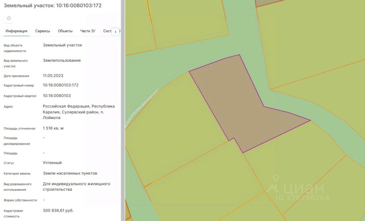 Площадь 1516 кв.м., местоположение: Российская Федерация, Республика Карелия, Суоярвский муниципальный округ, п. Лоймола, вид разрешенного использования - Для индивидуального жилищного строительства. Территориальная зона -Ж-1. Зона индивидуальной жилой застройки.