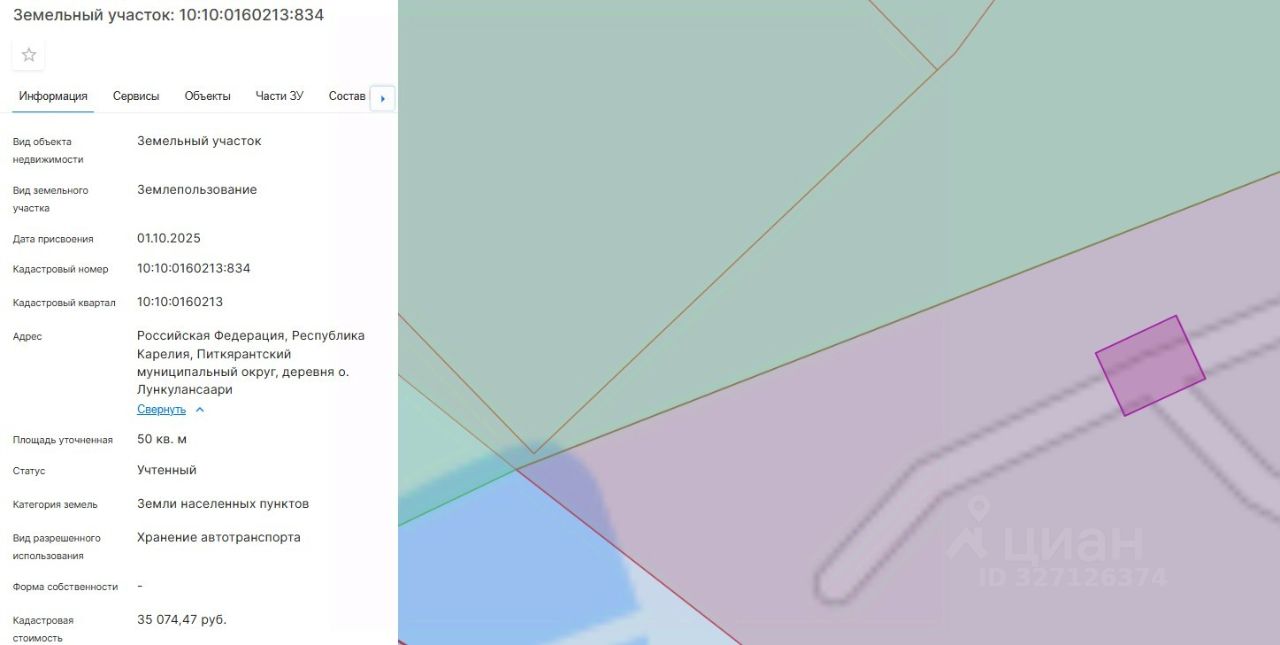 Площадь 50 кв.м, местоположение: Российская Федерация, Республика Карелия, Питкярантский муниципальный округ, деревня о. Лункулансаари, вид разрешенного использования - Хранение автотранспорта. Территориальная зона - ЖИ. Зона застройки индивидуальными жилыми домами.