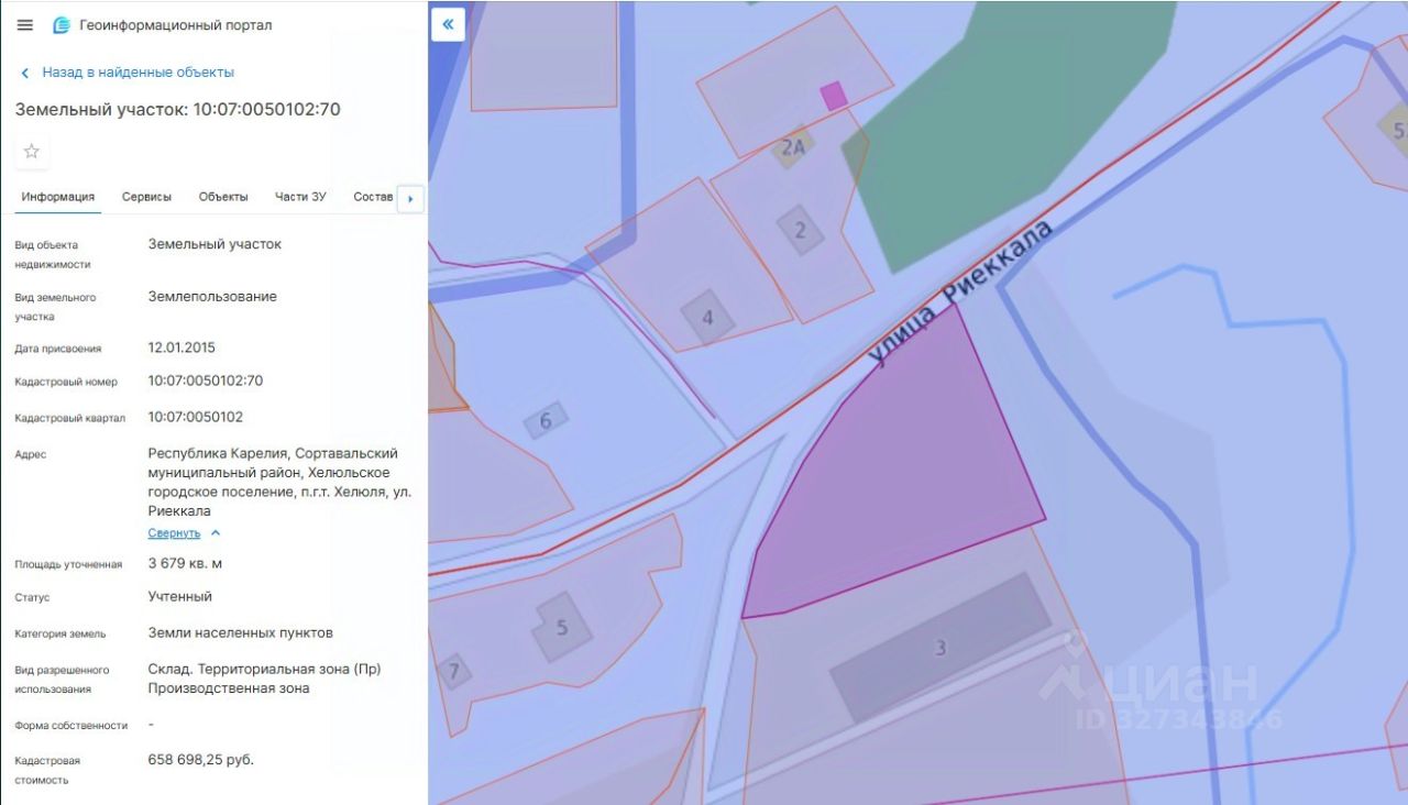Право заключения договора аренды земельного участка из земель населенных пунктов, имеющего кадастровый номер 10:07:0050102:70, площадью 3 679 кв. м, местоположение: Республика Карелия, Сортавальский муниципальный район, Хелюльское городское поселение, п.г.т. Хелюля, ул. Риеккала, вид разрешенного использования "Склад. Территориальная зона (ПР) Производственная зона".