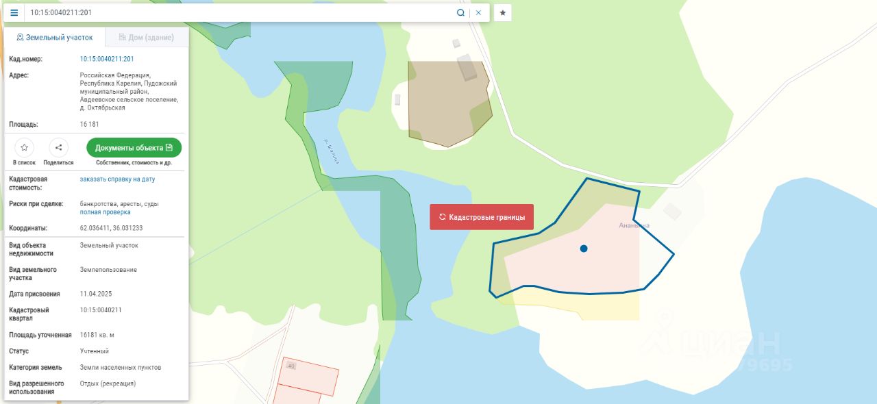 Право заключения договора аренды земельного участка из земель населенных пунктов, имеющего кадастровый номер 10:15:0040211:201, площадью 16181 кв.м, местоположение: Российская Федерация, Республика Карелия, Пудожский муниципальный район, Авдеевское сельское поселение, д. Октябрьская, вид разрешенного использования "Отдых (рекреация)". Территориальная зона Зона озелененных территорий общего пользования (лесопарки, парки, сады, скверы, бульвары, городские леса) (РО).