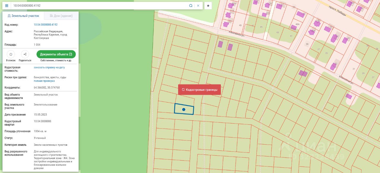 Право заключения договора аренды земельного участка из земель населенных пунктов, имеющего кадастровый номер 10:04:0000000:4192, площадью 1004 кв.м, местоположение: Российская Федерация, Республика Карелия, город Костомукша, вид разрешенного использования "Для индивидуального жилищного строительства". Территориальная зона "Зона застройки индивидуальными и блокированными жилыми домами (Ж4)".